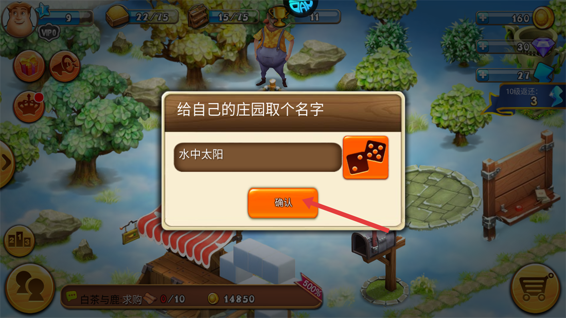 1、进入游戏后,咱们先给庄园取名,比如【水中太阳】,点击【确认】经营庄园吧。