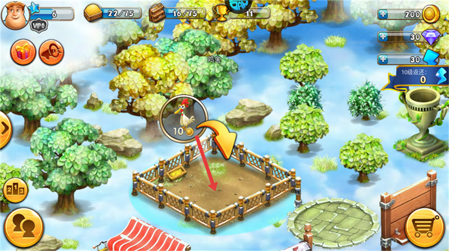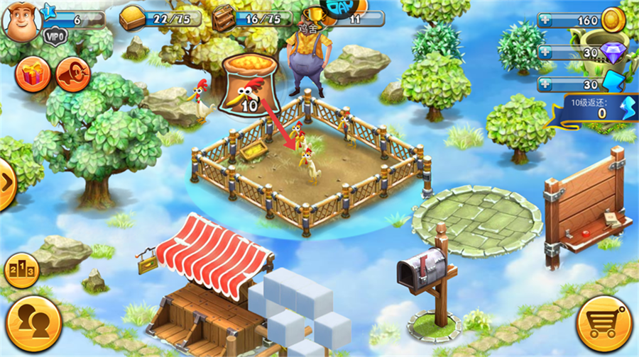 2、在庄园里建造鸡舍,放入小鸡,花费10金币就能让小鸡开始养殖,为庄园生产做准备呢。