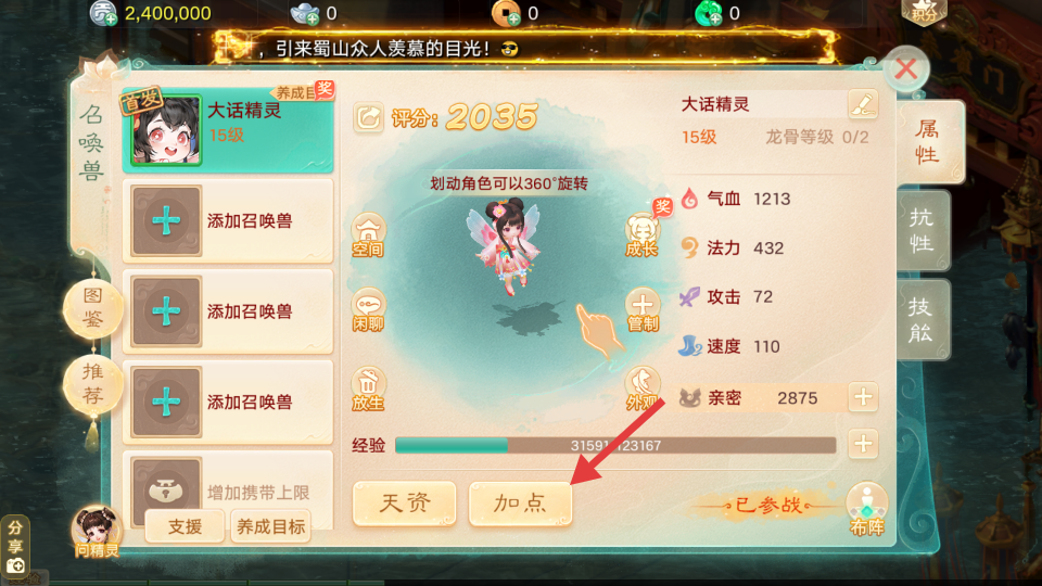 2、选择召唤兽,点击【加点】,进入属性加点界面。