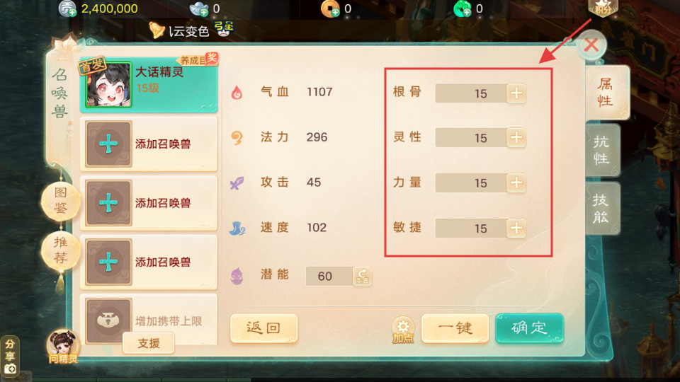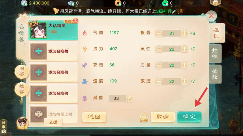 4、调整完成后,点击【确定】,提高召唤兽属性。