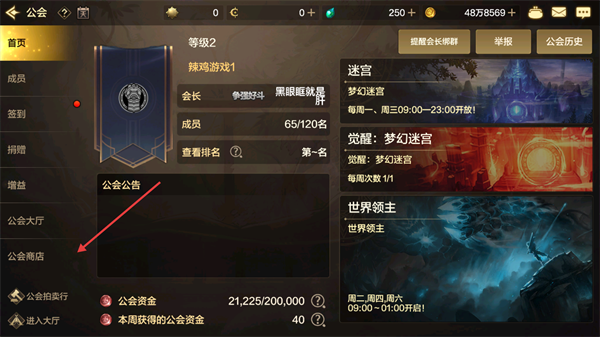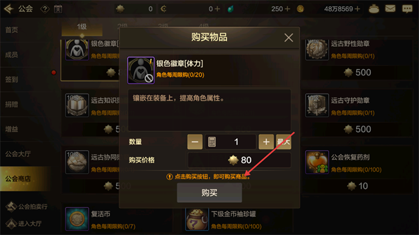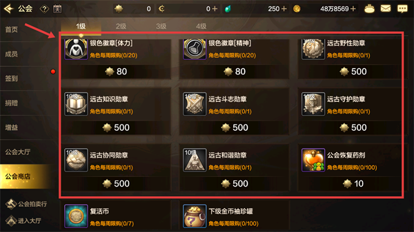 3、公会商店中,有【银色徽章-体力】【远古野性勋章】等物品。