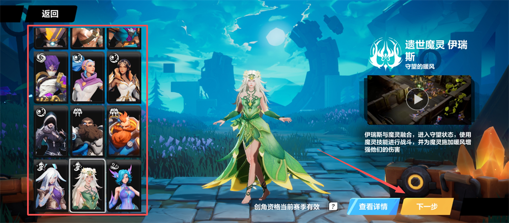 2、创角时选好心仪角色,比如【遗世魔灵-伊瑞斯】,了解其技能特点后点击【下一步】,开启独特征程。
