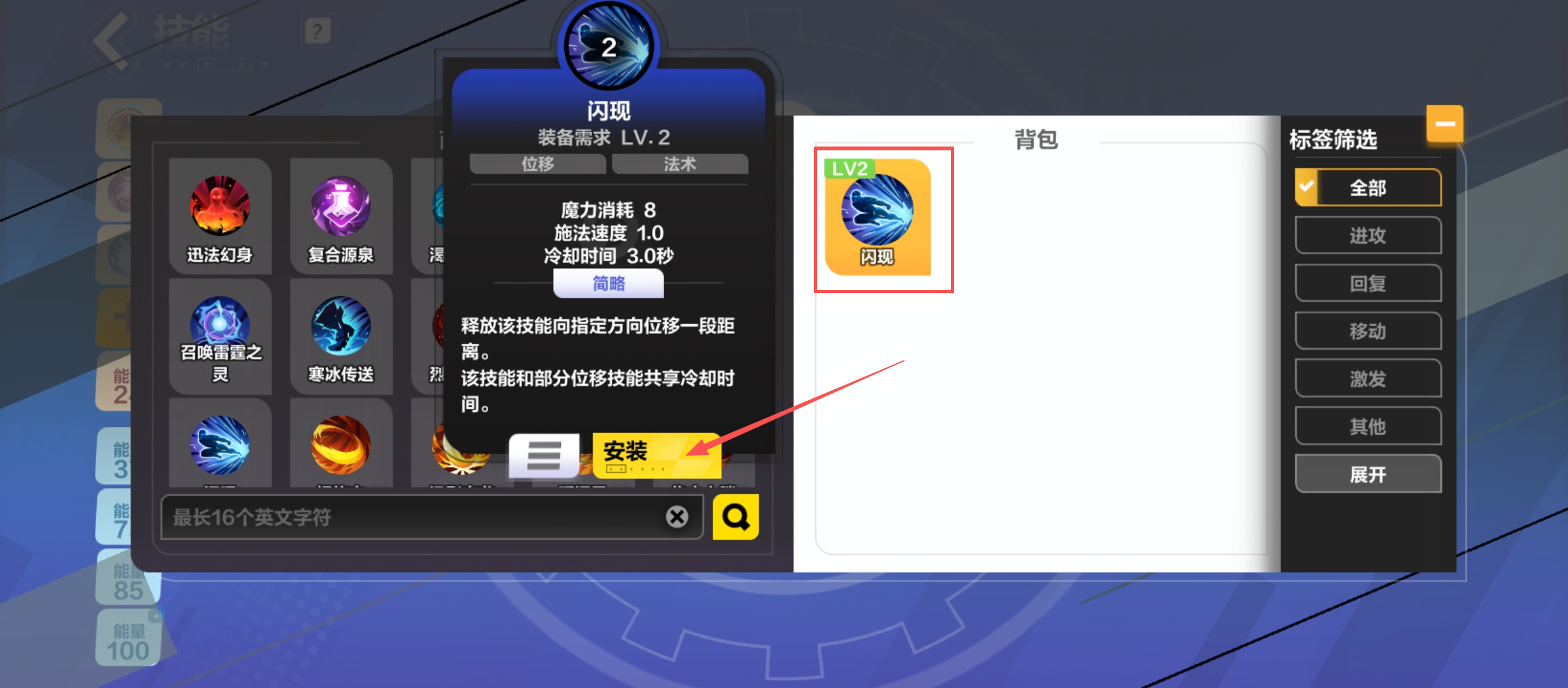 3、在技能界面查看【闪现】,点击安装,为角色增添位移能力,提升走位灵活性。
