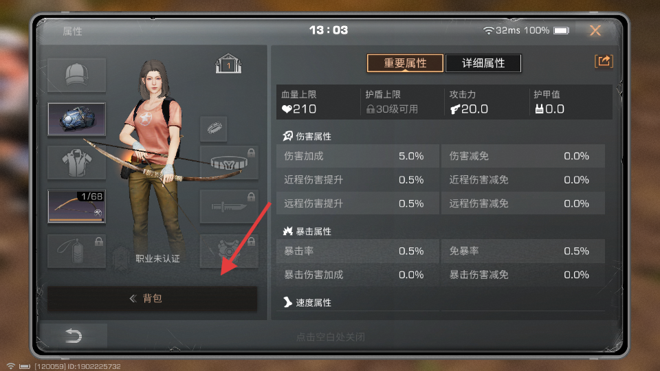 3、在角色属性界面,点击【背包】,进入背包界面。