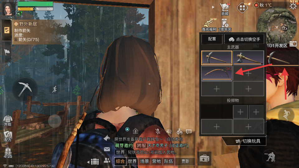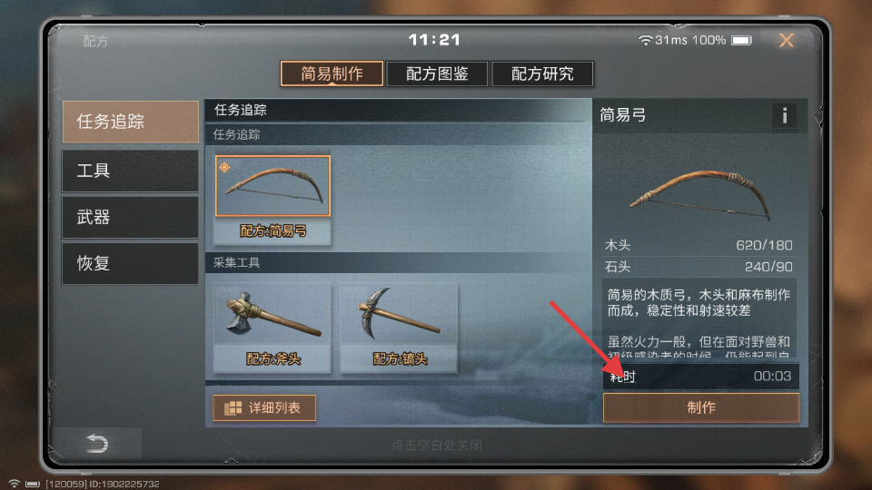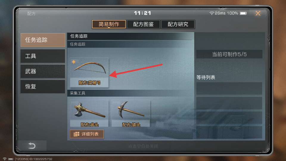 4、点击右侧装备图标,即可看到刚刚制作好的简易弓。