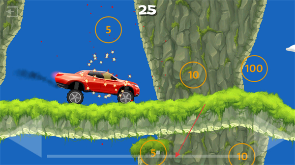 4、在山间平台行驶时,继续撞击金币圈收集金币,积累分数,顺利完成爬坡赛。