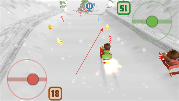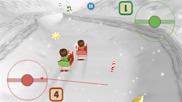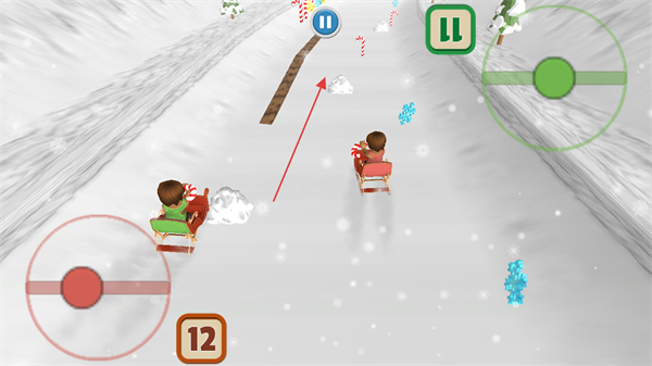 1、操控雪橇在雪地赛道上行驶,通过左侧的控制按钮调整方向,躲避障碍物。