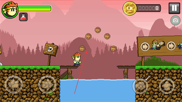 1、控制角色跳跃收集金币,注意避开带有骷髅标识的危险区域,沿路径前进。