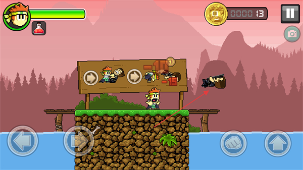 2、靠近敌人后攻击,击败敌人获取金币,根据标识牌提示推进游戏。