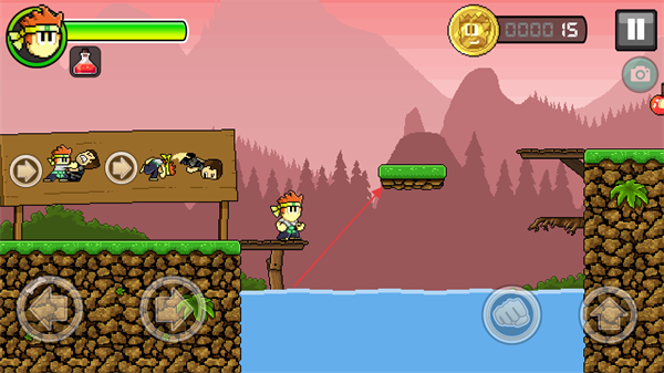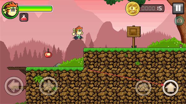 4、点击跳跃按钮,跳到高处平台,收集苹果等道具,推进游戏进程。
