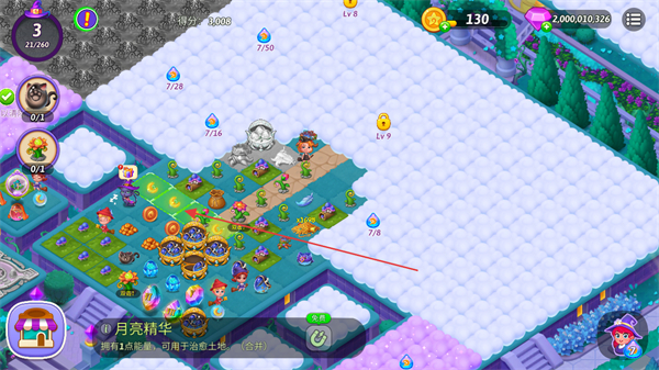 1、收集月亮精华,用于治愈土地,拓展可操作区域,为合并元素创造空间。