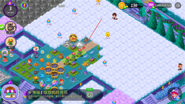 2、合并成长中的月亮花,使其升级,产生更多资源,推动游戏进程。