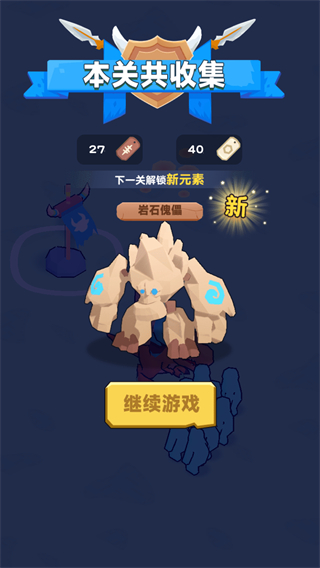 4、通关后可收集资源,解锁新元素如岩石傀儡,提升战力,继续挑战下一关。