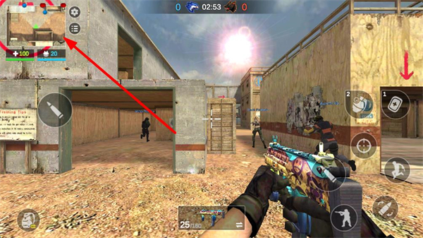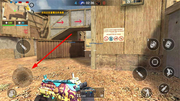 1、进入游戏后,通过左下角虚拟摇杆操控角色移动,可在战场中自由穿梭,利用掩体躲避敌人攻击,寻找有利位置发起进攻。