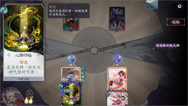 2、第二回合式神升级时,虽然选择升级两位式神都可通关,但最合理的应该是升级犬神。我们观察到手中的两张牌,犬神法术牌“心即归处”需要犬神达到2级才可使用,而桃花妖的法术牌“桃之馨息”1级就可以使用,所以当我们升级犬神后,两张牌都可使用,反之则不可。这也是我们对战中升级式神选择上的小技巧。