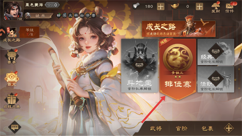 1、进入游戏后,我们可以点击推荐的【排位赛】竞技对战,在对局中展现策略,提升官阶哦。