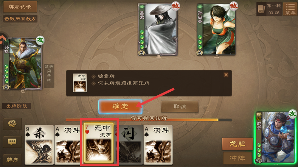 3、出牌阶段,使用【无中生有】这张锦囊牌,点击确定,就能从牌堆顶摸两张牌,扩充手牌资源呀。