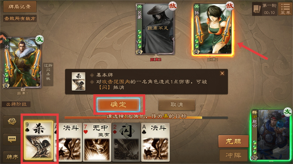 4、当我们打出【杀】时,选择敌方的孙尚香为目标,点击确定即可对其造成1点伤害,推进战局啦。