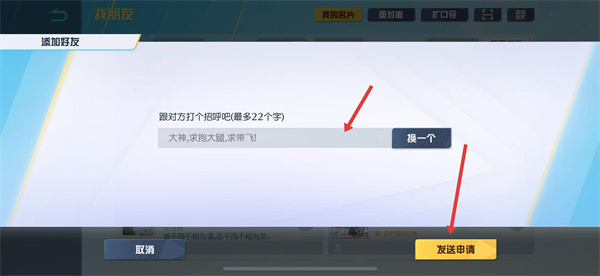 4、在添加好友弹窗中,可使用默认招呼语或更换,点击【发送申请】,完成好友添加操作。