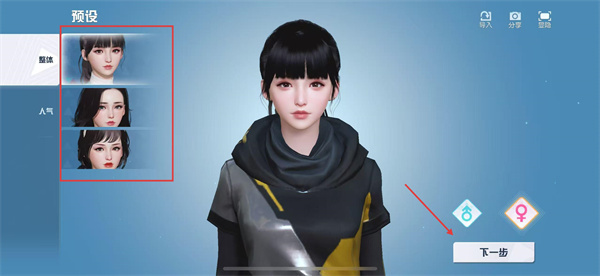 1、在角色预设界面,可从【整体】【人气】等预设形象中选择,选好后点击【下一步】。
