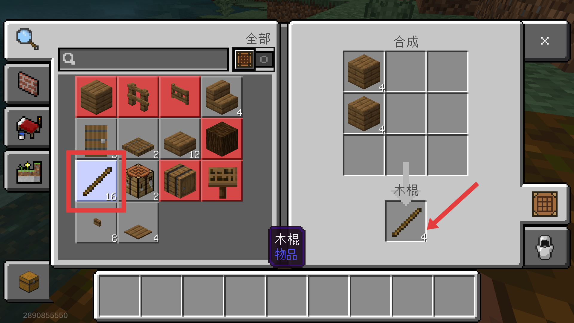 1、在合成界面用木板制作【木棍-4】,这是制作工具的基础,可得先备好哦。