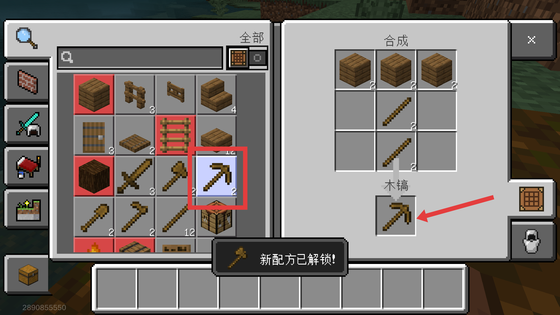2、有了【木棍】后,搭配木板合成【木镐】,解锁挖矿新工具,挖矿效率就靠它啦。