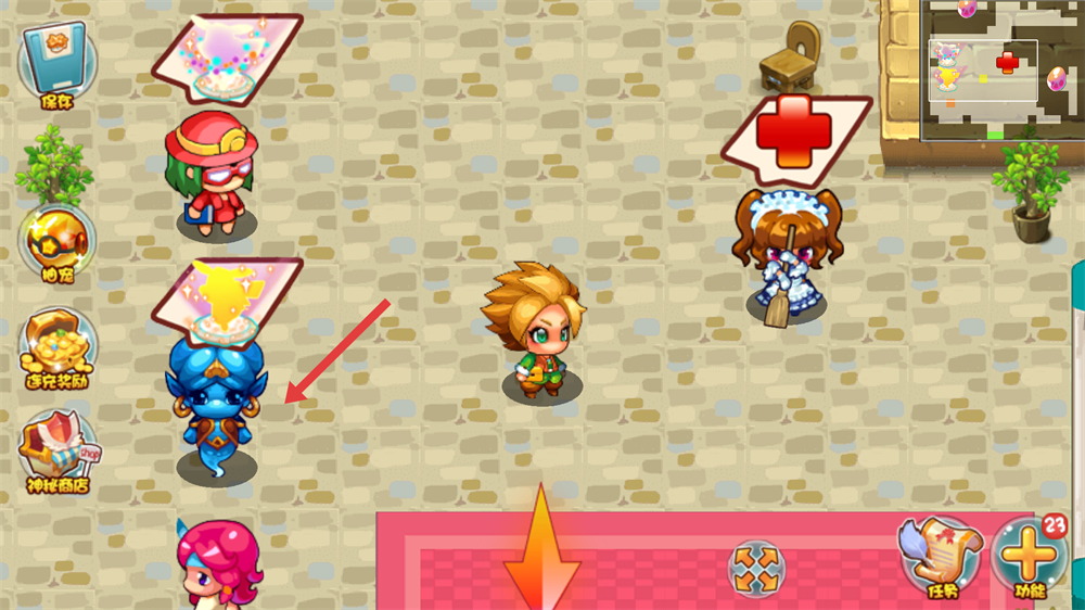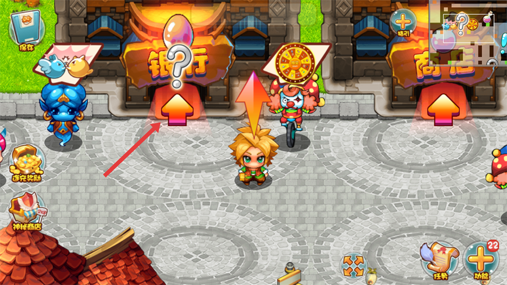 3、在【银行】里,与蓝色角色互动,准备让精灵突破,大幅提升战斗力呀。