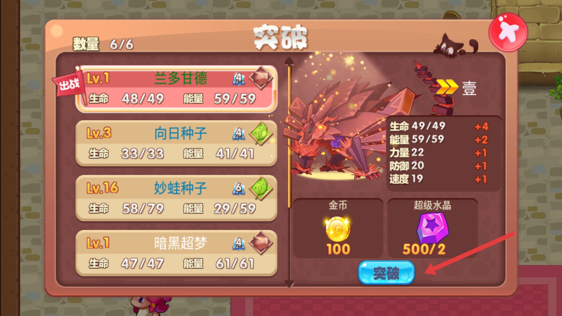 4、在精灵突破界面,我们可消耗金币和超级水晶,让精灵突破,增强战力啦。