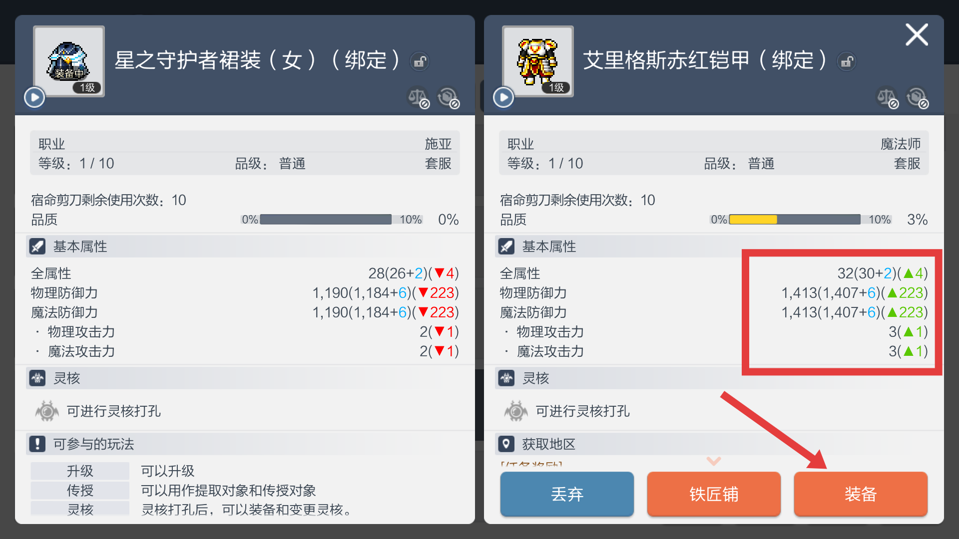 1、获得新装备如【艾里格斯赤红铠甲】时,点击【装备】按钮更换,对比属性选择增益高的。