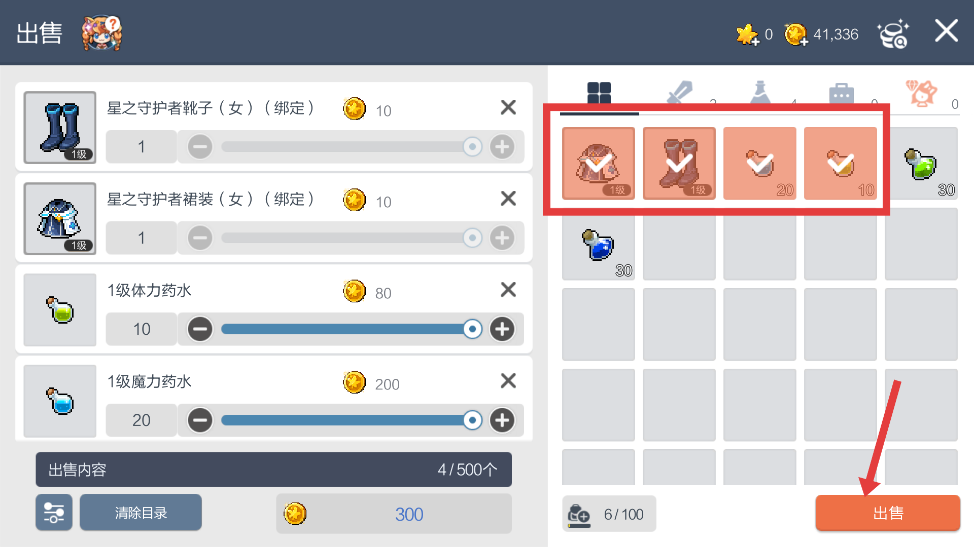 2、整理背包时,选择【星之守护者靴子】等无用装备,点击【出售】获取金币,让背包更整洁哦。