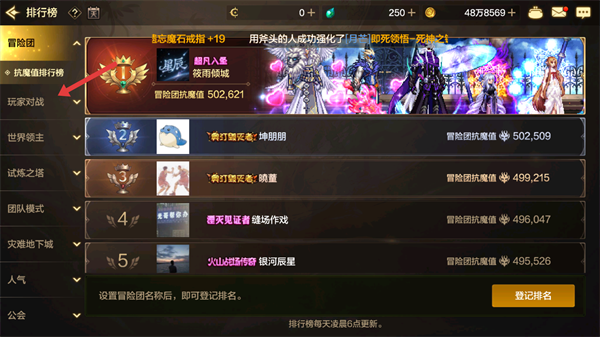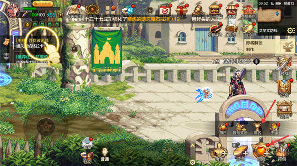 1、在【冒险】专栏点击【排名】,进入排行榜界面。