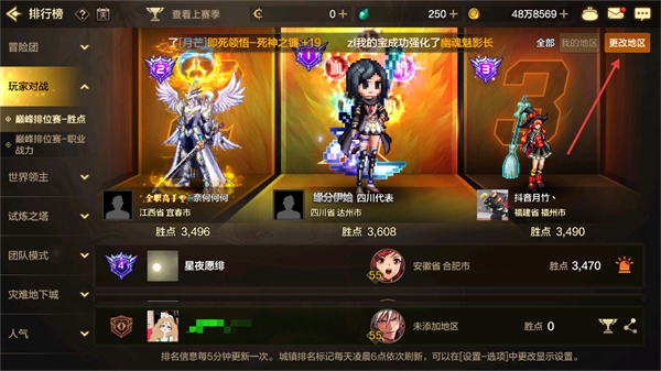 3、进入后可见巅峰排位赛排名信息,点击【更改地区】按钮,进入地区选择界面。