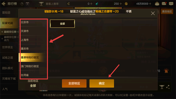 4、可选择多个地区,选择目标地区后点击【确定】,完成地区更改,便于查看特定区域玩家的对战排名。