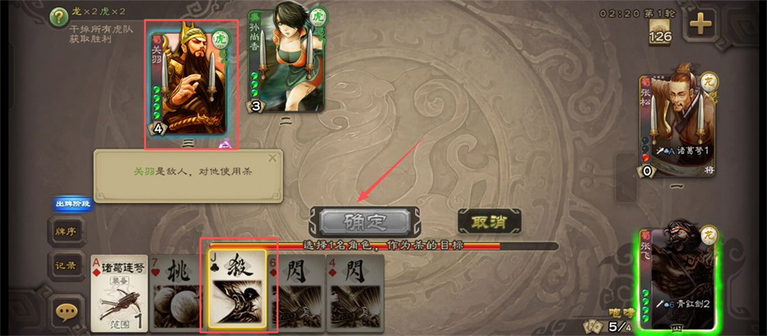 4、选择【杀】对敌方关羽使用,配合青釭剑的效果,高效发起攻击,助力快速歼灭敌人呢。