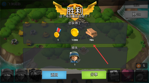 4、战斗胜利后,获取【勋章、金币、木材】奖励。