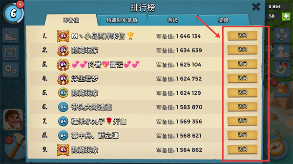 2、在排行榜中,选择目标玩家右侧的【访问】按钮,进入其基地,了解高玩布局。