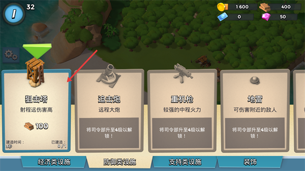 2、在建筑选择栏中,选择【狙击塔】,消耗【100】木材。