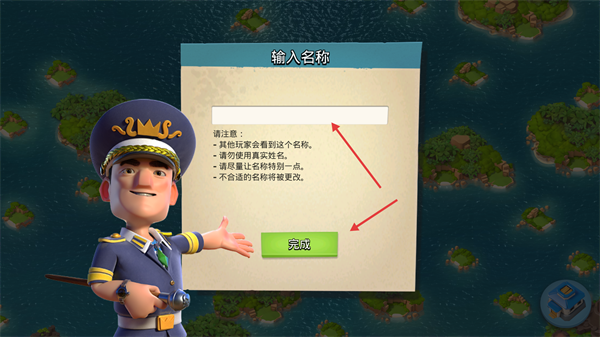 2、进入游戏后,在【输入名称】界面设置玩家名称,设置完成后点击【完成】。