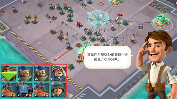 3、选择火箭直升机等部队,按照提示在左侧远处部署两个火箭直升机小分队。