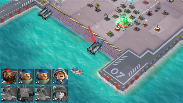 《海岛奇兵》从沙滩指定范围内登陆。然后在海面上有战舰提供导弹、医疗支援,同时还能释放引导弹进行实时打击目标指挥。至于坐着登陆艇成功冲上岸的士兵,全自动战斗,会优先攻击最近的建筑,这时就需要你引导他们集中火力,打掉敌方防御工事先。最后,只要摧毁敌人的司令部就能引爆敌人整个基地,获得胜利,拿到战利品。