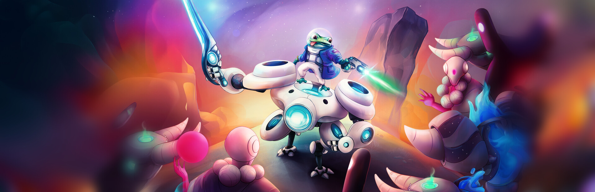玩家同时操作机甲和太空青蛙。这两位角色各具特点,机甲擅长近战与高火力攻击,太空青蛙则擅长远程精确射击。