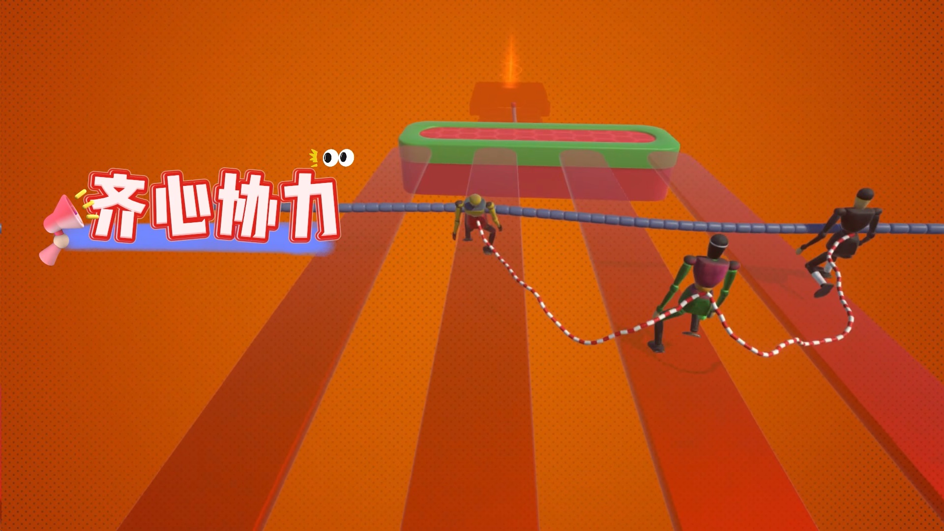 合作模式:与朋友们一起被绳子连接,团队需要密切合作,制定策略,克服可能的障碍,共同完成目标。