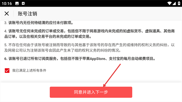 4、在账号注销界面,勾选满足条件后点击【同意并进入下一步】,按提示完成后续注销操作。