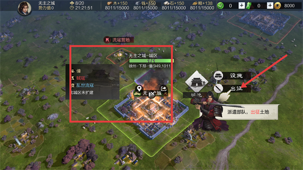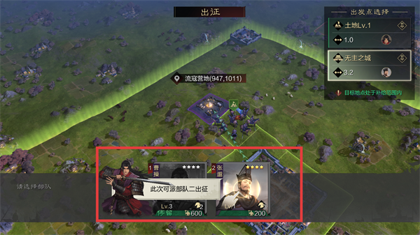 1、在城池界面点击【出征】,选择流寇营地等目标土地,派遣部队出征,可获取资源并提升势力值。