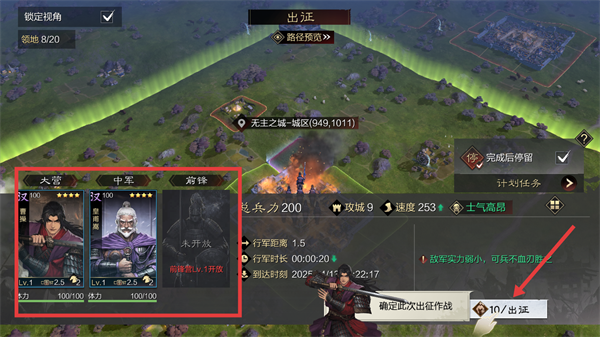 4、当拥有多支部队时,可选择不同武将部队分别出征,同时推进多线作战,高效扩张领地。