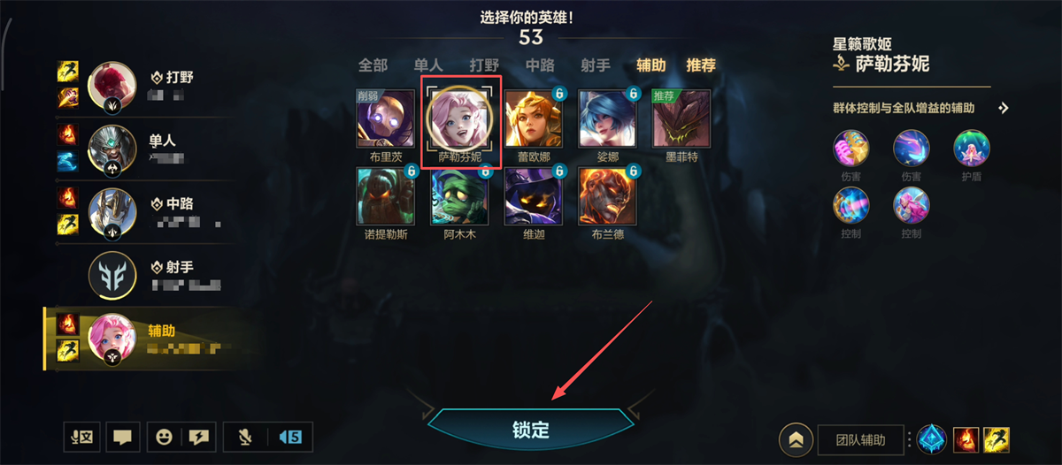 1、选择【萨勒芬妮】后及时点击【锁定】,确认英雄选择呢。