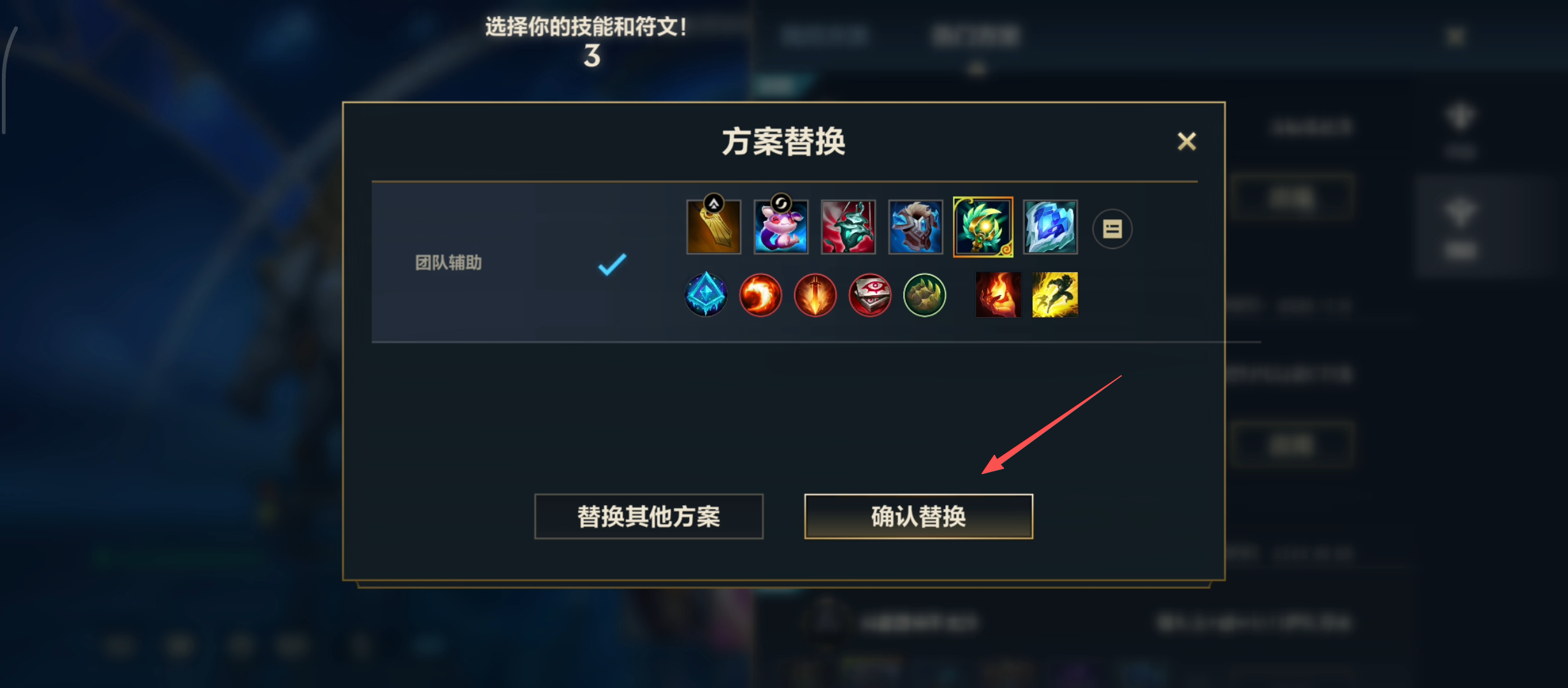 2、在技能符文界面,选定【团队辅助】方案后点击【确认替换】,使技能符文配置契合辅助玩法。