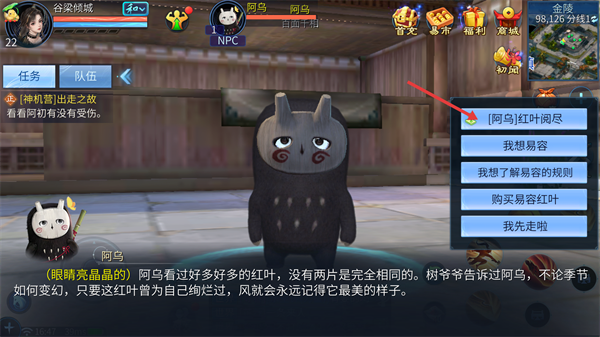1、与NPC阿乌对话,选择【[阿乌]红叶阅尽】选项,触发剧情任务。