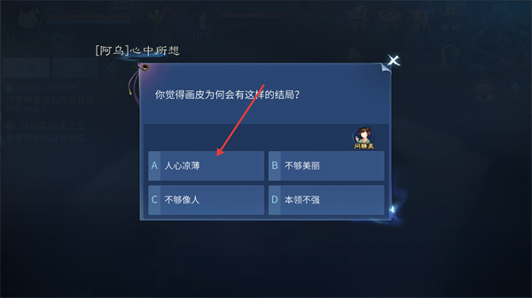 3、在问题“你觉得画皮为何会有这样的结局?”中,选择选项A【人心凉薄】。