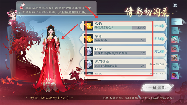 2、进入【倩影初闻录】界面,完成所有任务,可获取【初心之约(7天)】时装奖励。